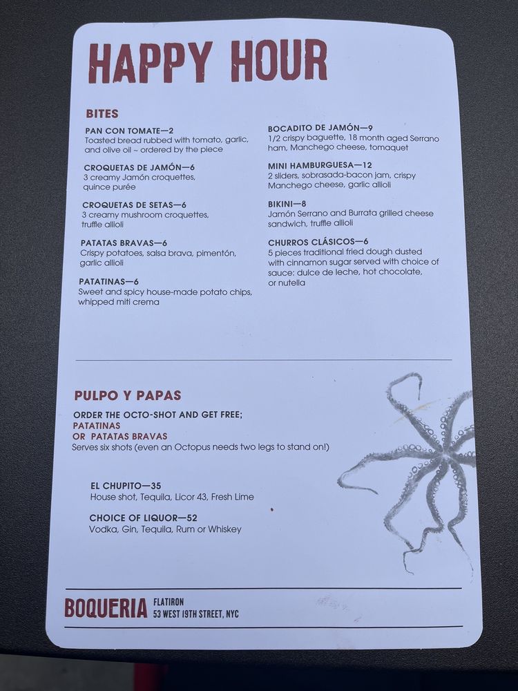 Boqueria Flatiron, located at 53 W 19th St in New York City, offers a trendy and vibrant dining experience. The menu boasts Pescatarian, Vegan, and Vegetarian options, making it a great choice for a variety of diners. With a full bar and a Free-Flow Beverage option including classic and deluxe sangrias and mimosas, guests can enjoy a lively atmosphere and delicious drinks. Customers rave about the patatas bravas and croquetas during happy hour, highlighting the quality and value of the food. The cozy yet bustling ambiance, top-notch service, and customizable chef's menu make Boqueria Flatiron a standout choice for tapas in the city. Don't miss out on the chance to experience this hidden gem for yourself.
